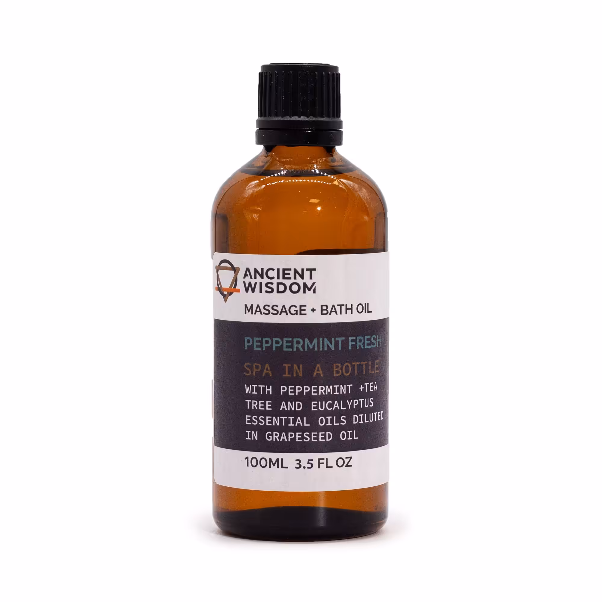 Your Peppermint Fresh Massage Oil is made with worlds known Ancient Wisdom quality Peppermint, Tea Tree and Eucaliptus Essential Oils and Pure Grapeseed Oil.