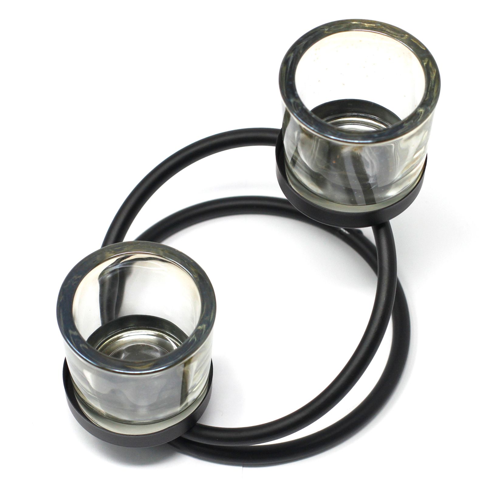 Made of iron and glass.Size of the Candle Holder: Lenght: 14cm Width: 17.5cm, Height 14.5cmSize of the Glass: Diameter 6.5cm, Height 6cm