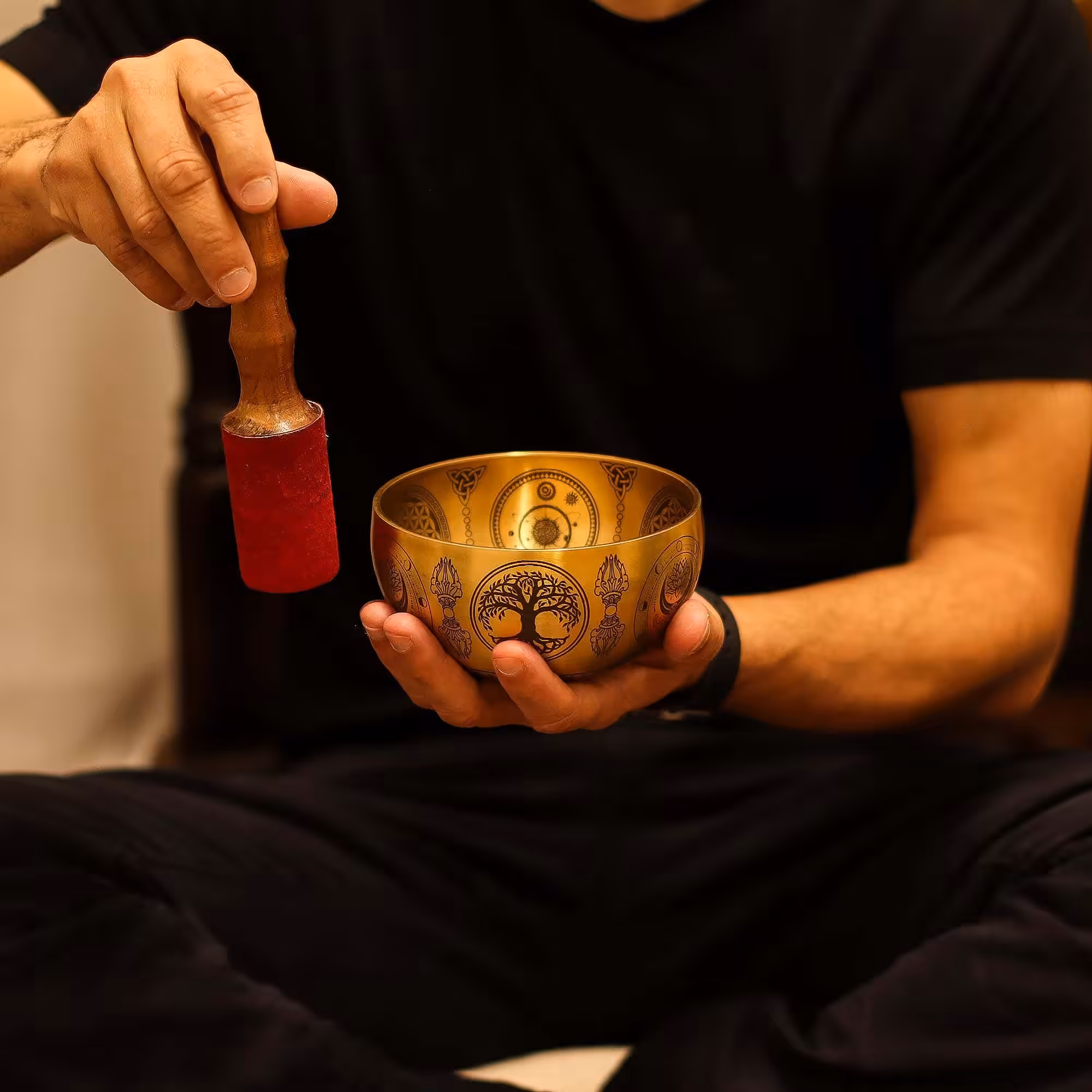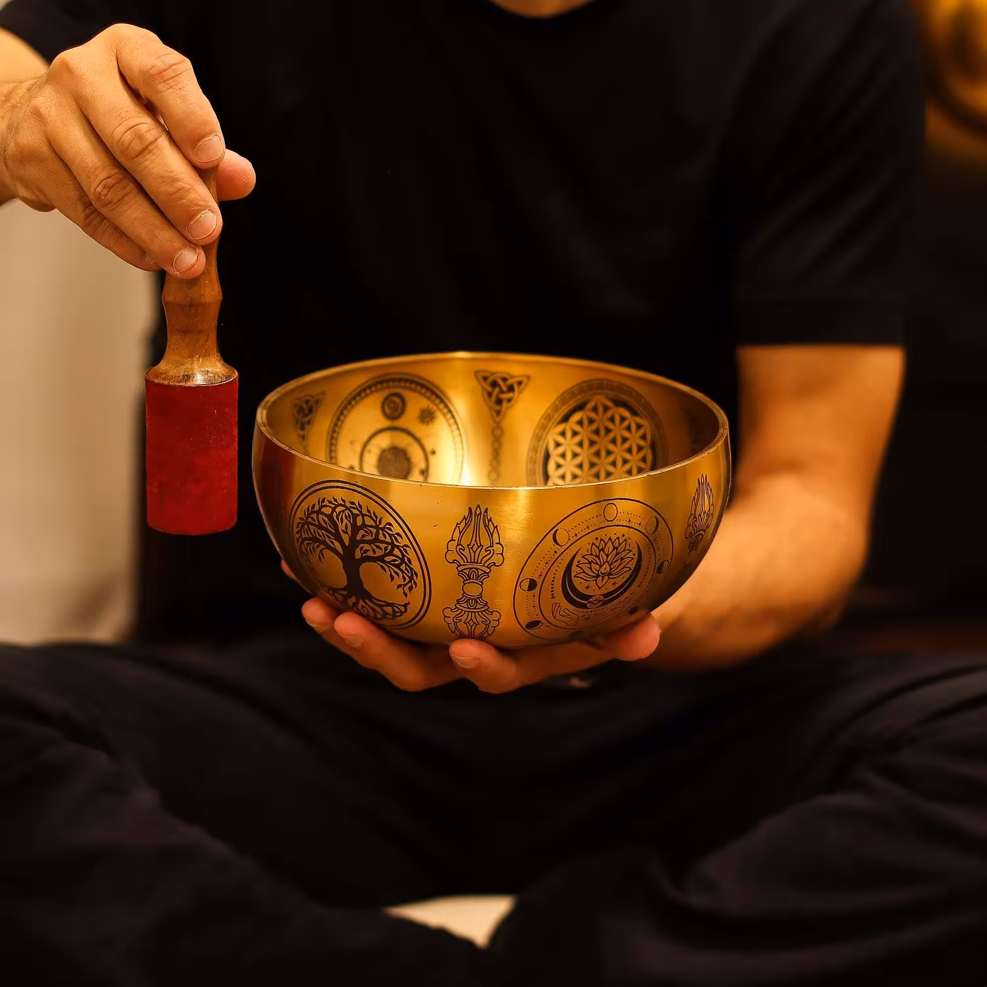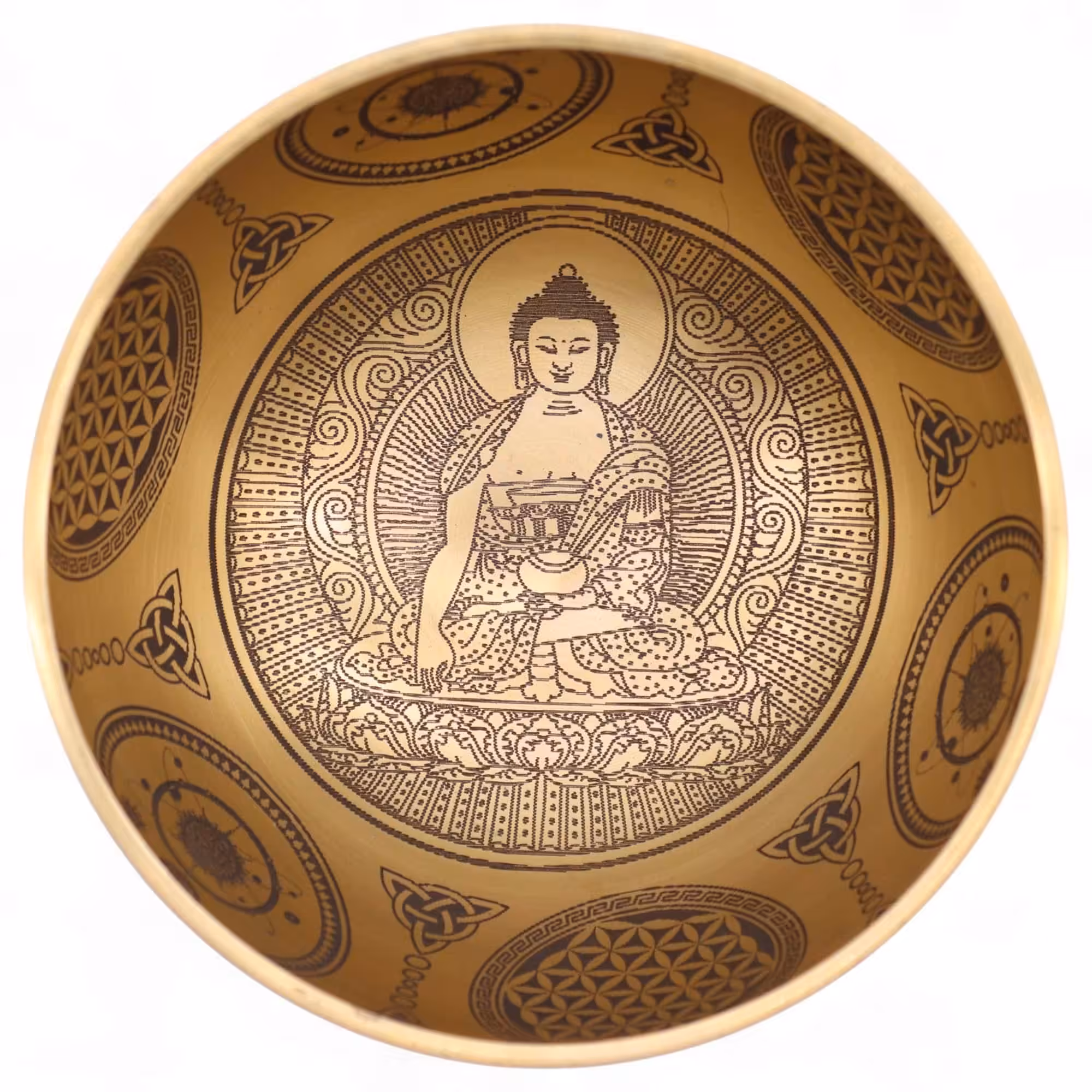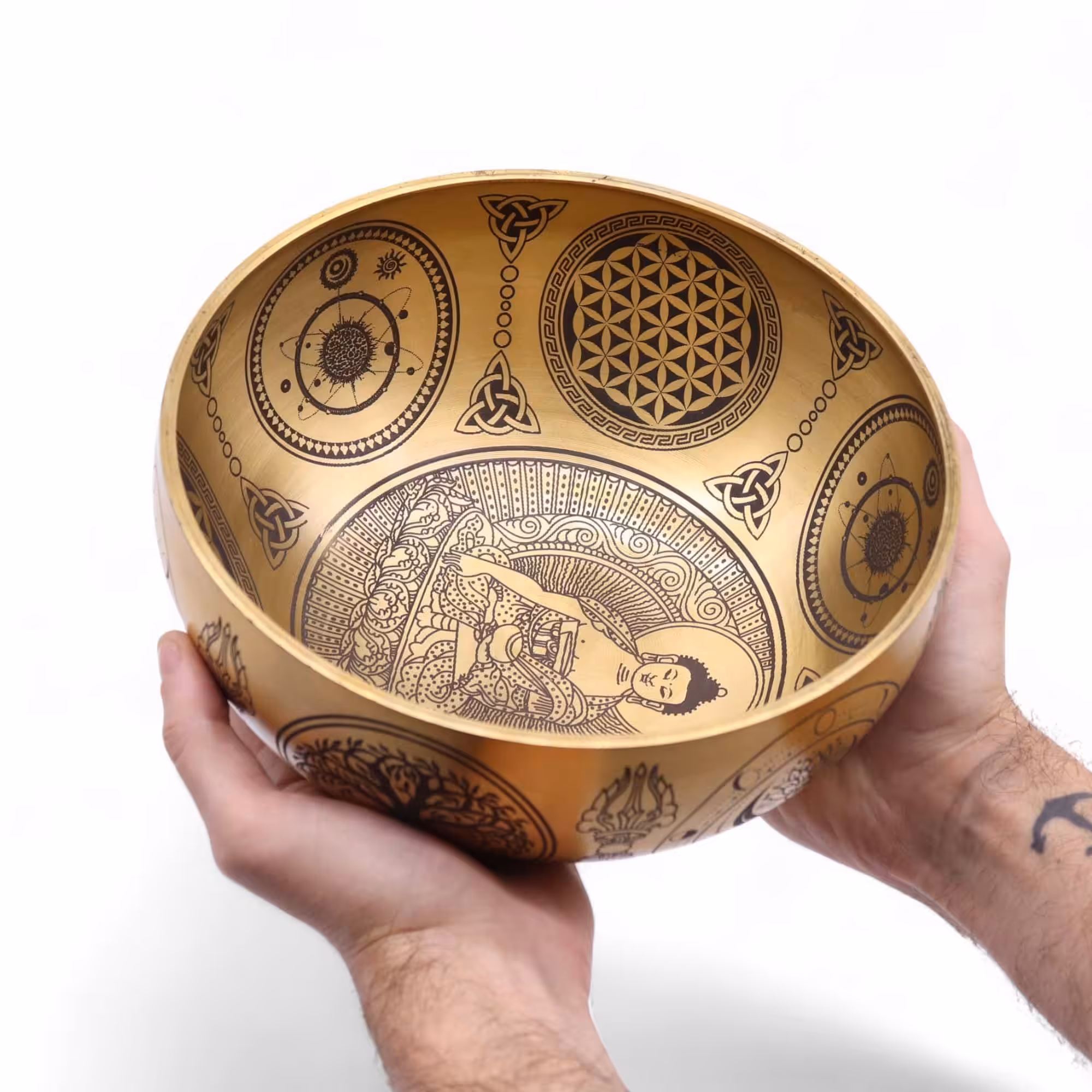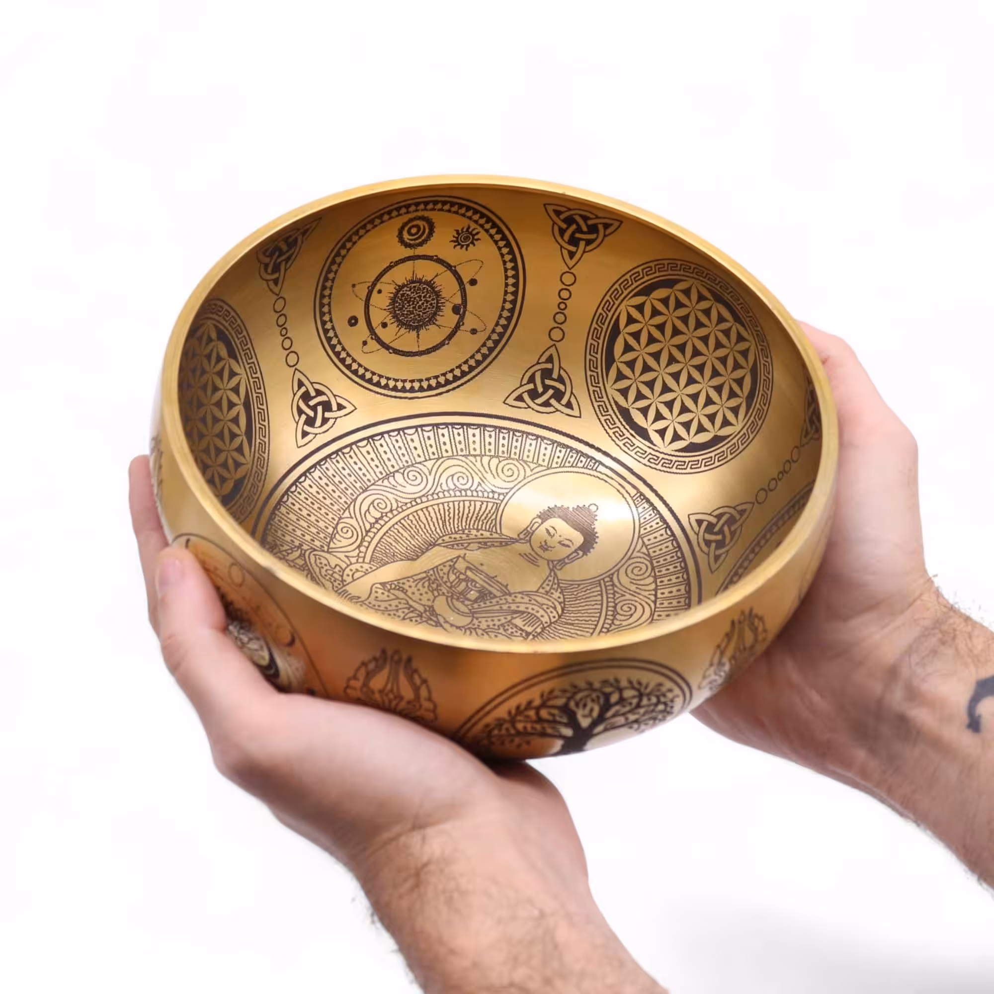 This handcrafted set of four brass singing bowls captures the artistry and symbolism of Tibetan tradition. Each bowl is intricately etched with sacred patterns, including the Buddha motif, Tree of Life, lotus flowersand geometric mandalas – representing harmony, wisdomand enlightenment.