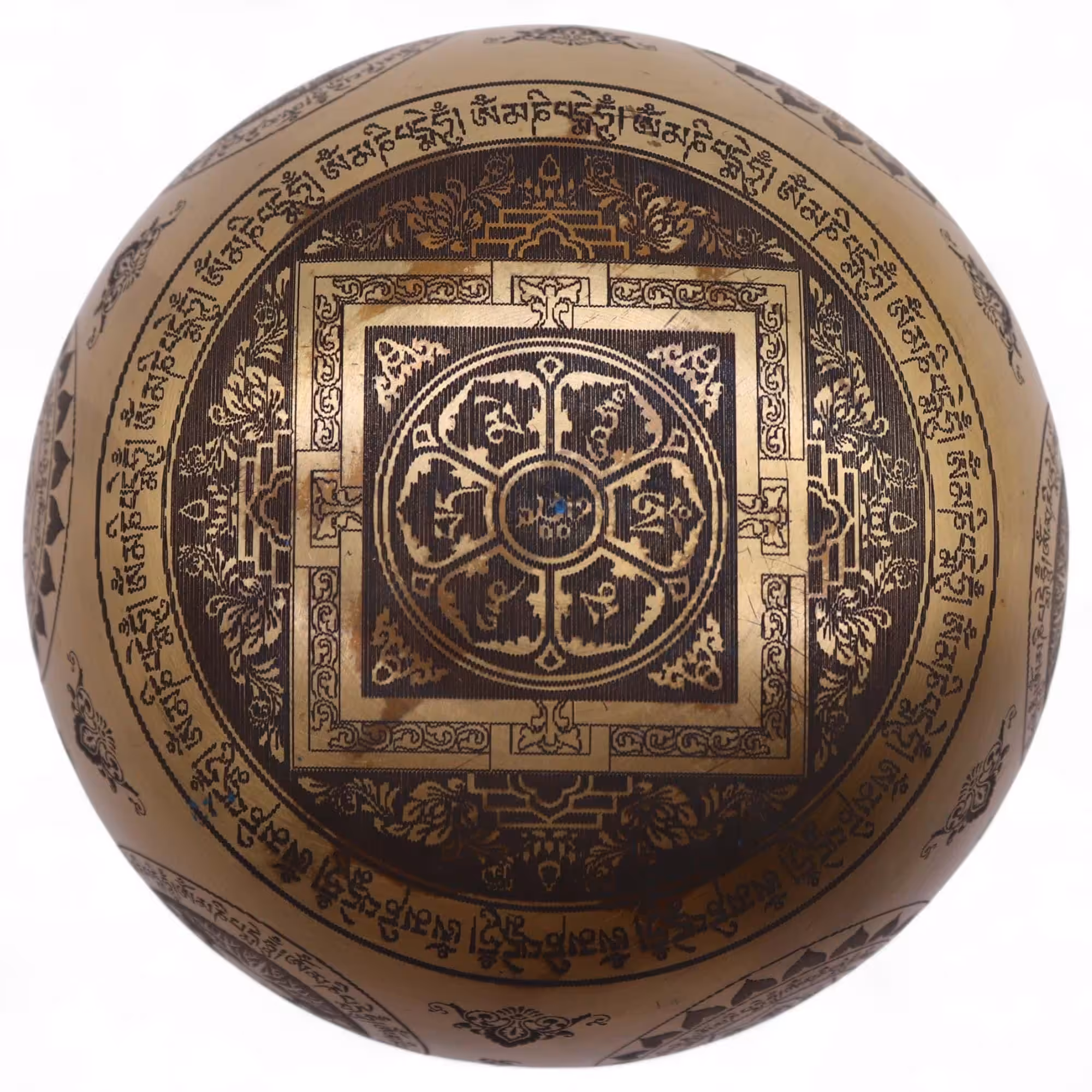 A striking collection of four handcrafted brass singing bowls, each intricately etched with yogic and spiritual symbolism. The detailed engravings of mantras, chakrasand sacred figures reflect centuries of artistic and meditative tradition, making each piece both decorative and meaningful.