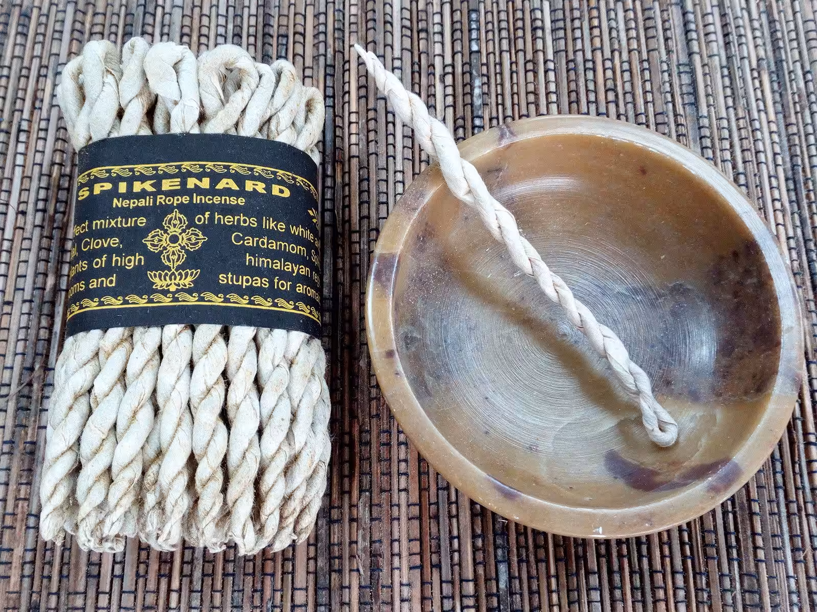 Incense ropes are made by hand in a process that involves bundling the ingredients in a special hand prepared rice paper, then rolling and twisting it into a small rope-like braided form. The rope should be burnt in a marble or metal dish, or on an ash bed, a special incense burner. This rope type of incense can produce a substantial amount of smokeand it can quickly overpower a small room so use sparingly..