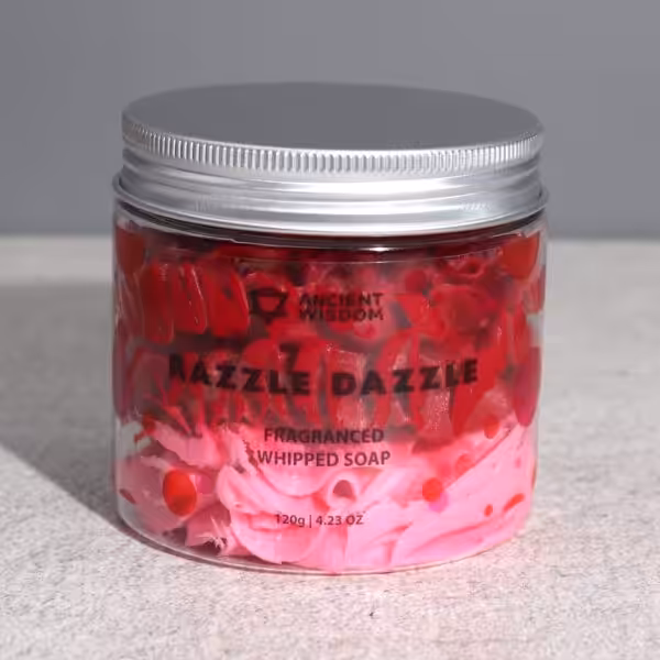 The Razzle Dazzle Whipped Cream Soap, weighing 120g, is a sumptuous addition to your bathing routine that belongs to the whipped soap category. This creamy, fluffy soap lathers beautifully, leaving your skin feeling soft, hydrated and thoroughly cleansed while enveloping you in a delightful fragrance that uplifts your senses.