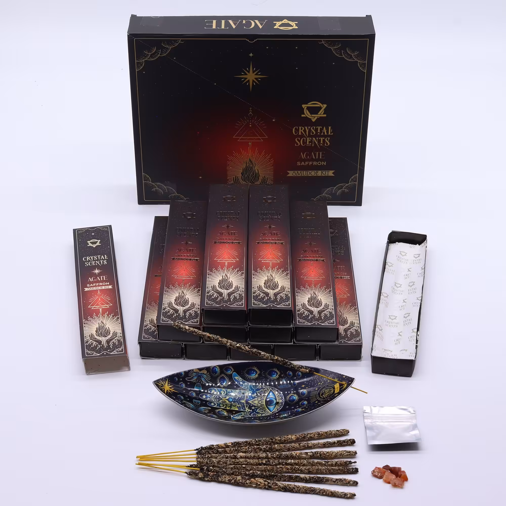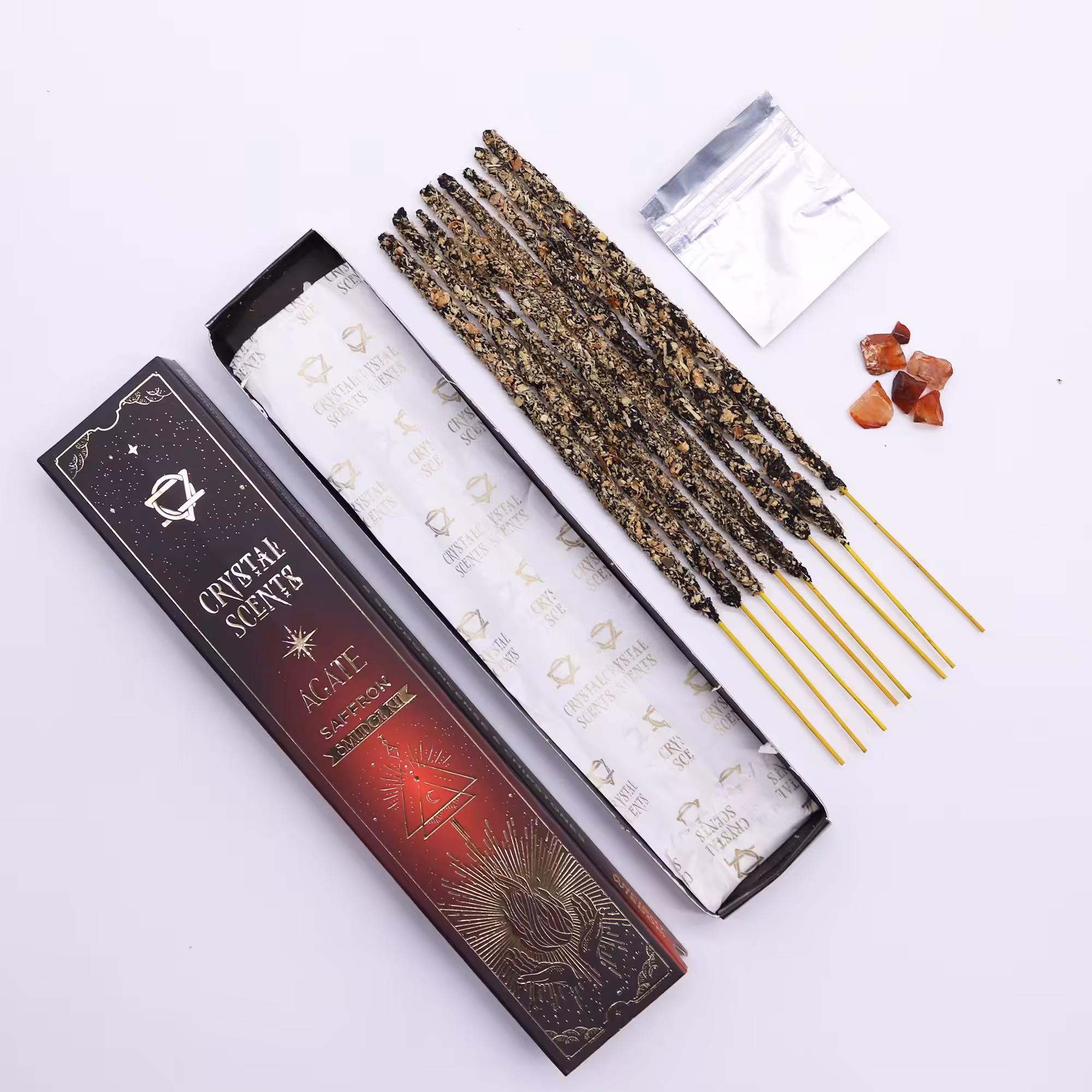 Add a rich, warm glow to your space with these Saffron Smudge Incense sticks, paired with natural red agate chipstones. Each stick is handcrafted in India using traditional smudge-style incense techniques.
