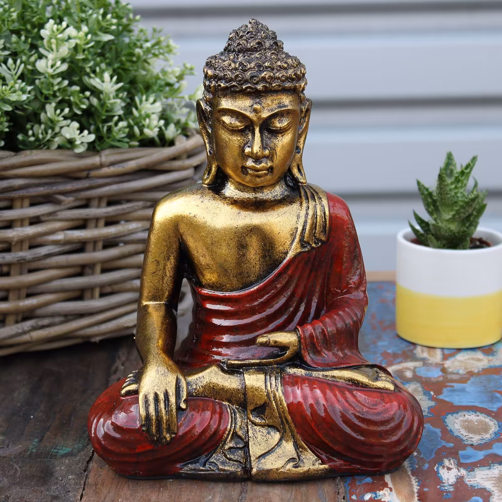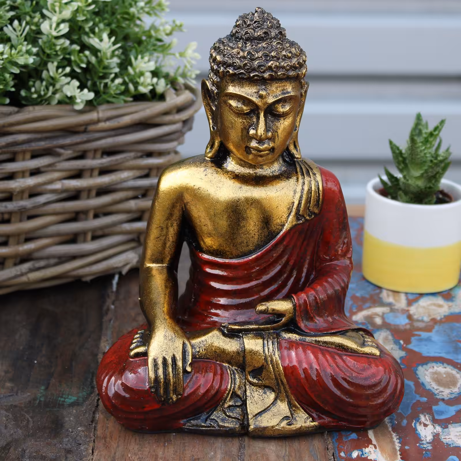 Cast in resin and lovingly hand painted and finished by Bali artisans. This classic Buddha pose is highly symbolic, known as the Varada Mudra. The right arm of the falls downwards, with the palm facing towards the viewer. The five extended fingers represent the five perfection, Generosity, Morality, Patience, Effort and concentration.