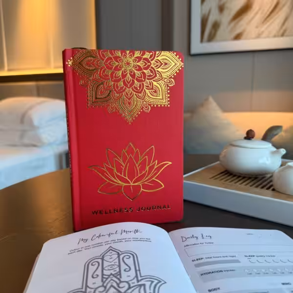 Bring balance and energy to your daily routine with this striking Red Wellness Journal, featuring a radiant golden mandala and lotus design. With 120 guided pages, it encourages mindful reflection through mood tracking, energy chartsand daily wellness logs.