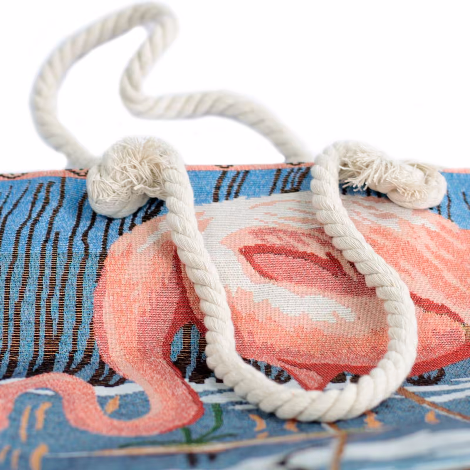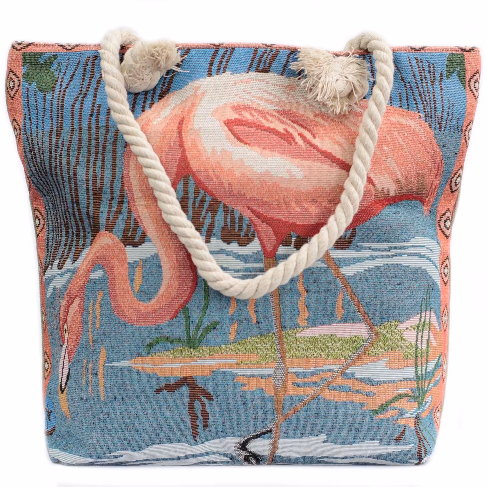 Take a look at this beautiful woven style featured in Pink Flamingo Design Beach Tote Bags in vintage blue and beige colours from Artisan Gifts.