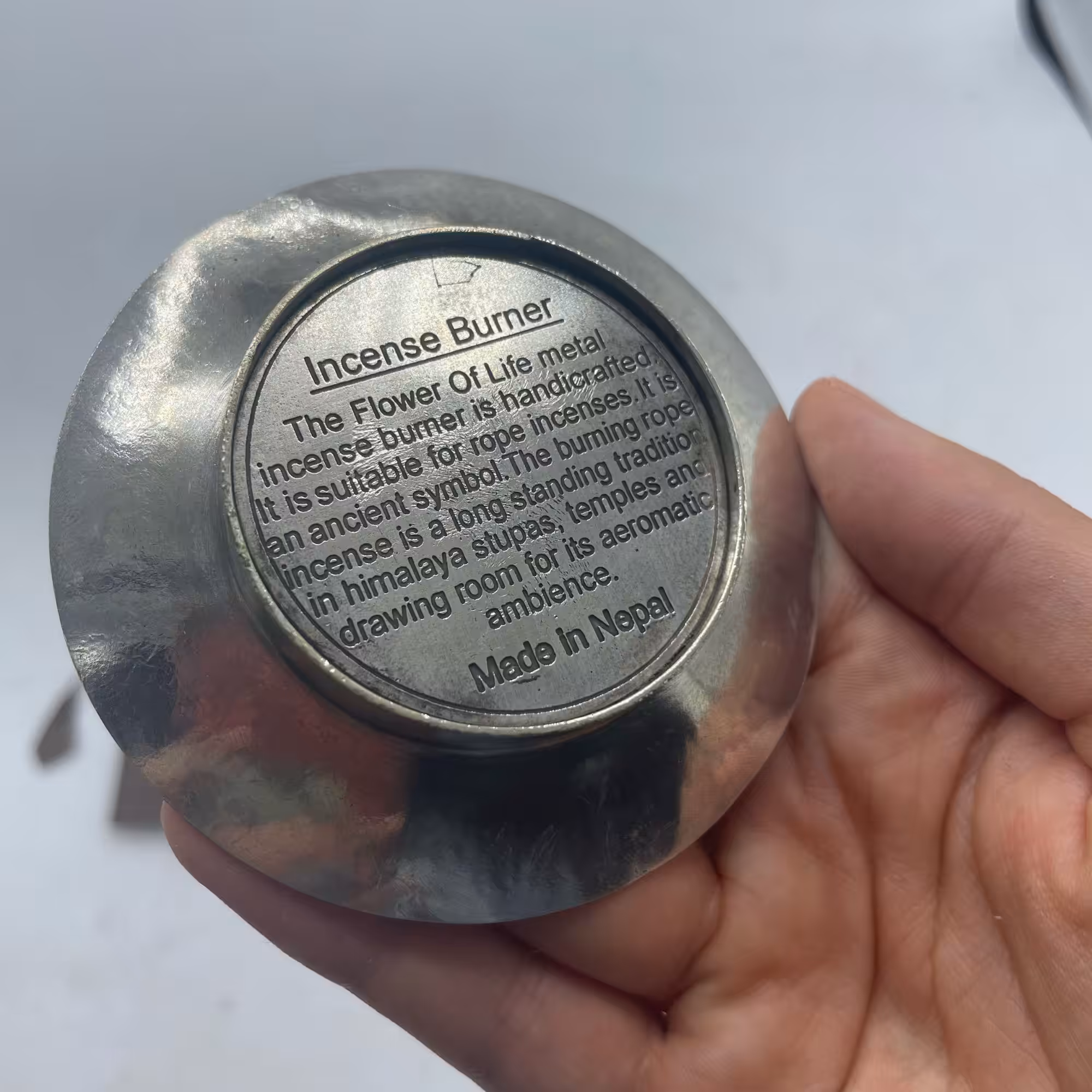 The silver-plated holder, adorned with the Flower of Life, is not only a functional piece for safely burning incense but also a decorative addition to your space. It's a beautiful way to honour the ancient traditions of the Himalayas and bring sacred geometry into your surroundings.
