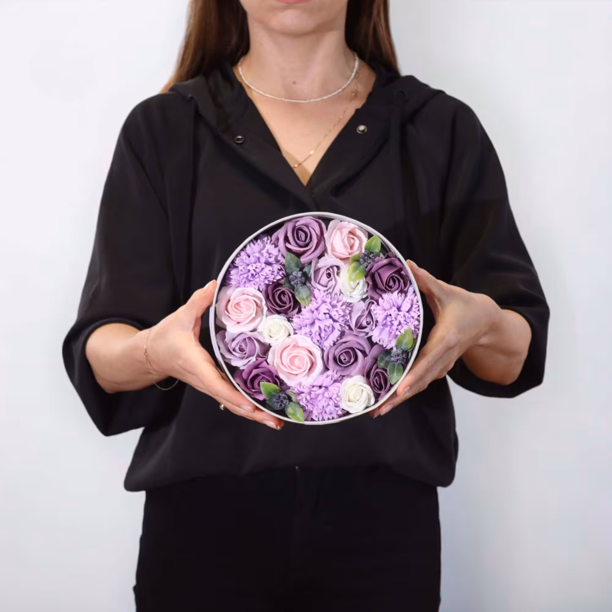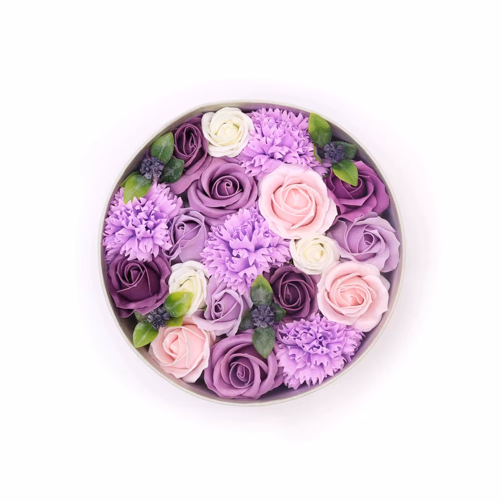 Spoil your customers with the opulence of purple and the beauty of roses and carnations. Our Soap Flower Gift Round Box in Purple Rose & Carnation is a statement of refined taste and affection.