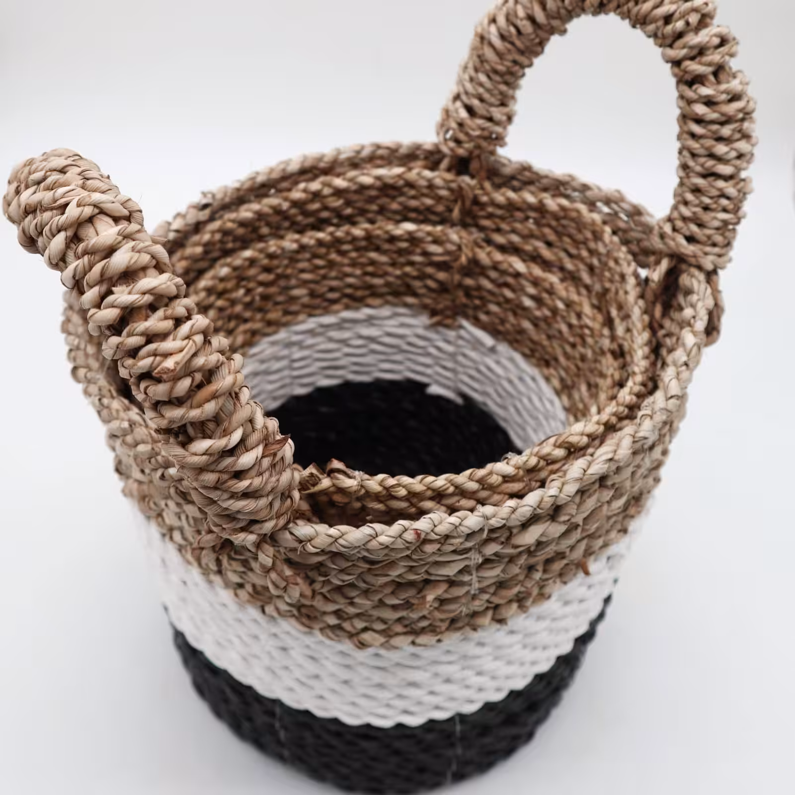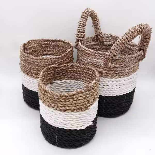 Seagrass Basket Set – Dark Grey/ Natural / White is perfect for displaying your products, multi-functional baskets are handwoven and add a genuine earthy look to any space. Sold in set of 3, each basket is handmade from eco-friendly seagrass. This easy to store trio is ideal for gift baskets, it can even be used as a chic flower pot. The largest one has an upper handle. Natural materials are seriously on trend, especially products made from nice looking seagrass are fashionable and easy selling. The colourful baskets can be used as tote bags, mini laundry baskets or to display your goodies you would like to have well-organized or easy and quick to grab. Dimensions of large basket: H: 17 cm (28 cm with a handle), D: 20 cmDimensions of middle basket: H: 16 cm, D: 17cmDimensions of small basket: H: 14 cm, D: 14 xm