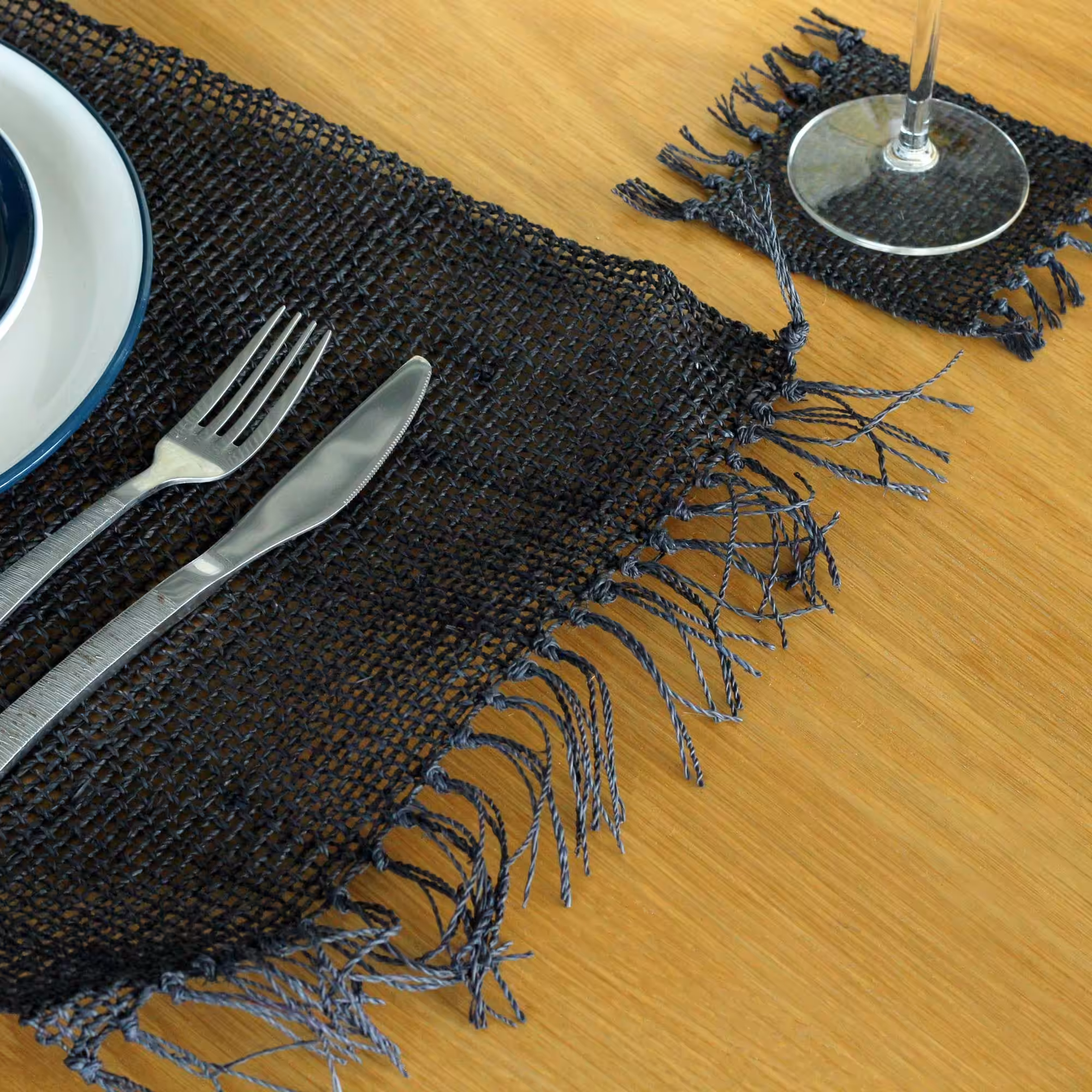 Expertly handcrafted by artisans in Indonesia from sustainable seagrass, this placemat features a bold black finish with fringe details, offering a modern and natural look. Its durable, eco-friendly materials and minimalist design make it a versatile addition to any dining setup, appealing to customers who prioritize both sustainability and style.