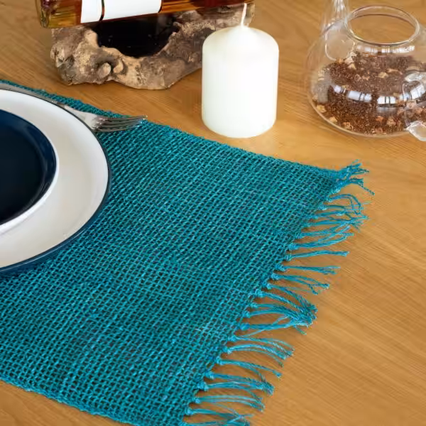 Handcrafted in Indonesia from sustainable seagrass, this placemat combines eco-friendly materials with a bold turquoise hue and fringe detailing, making it a perfect statement piece for customers who value both style and sustainability. Its durable construction and colourful design make it ideal for indoor or outdoor dining settings.