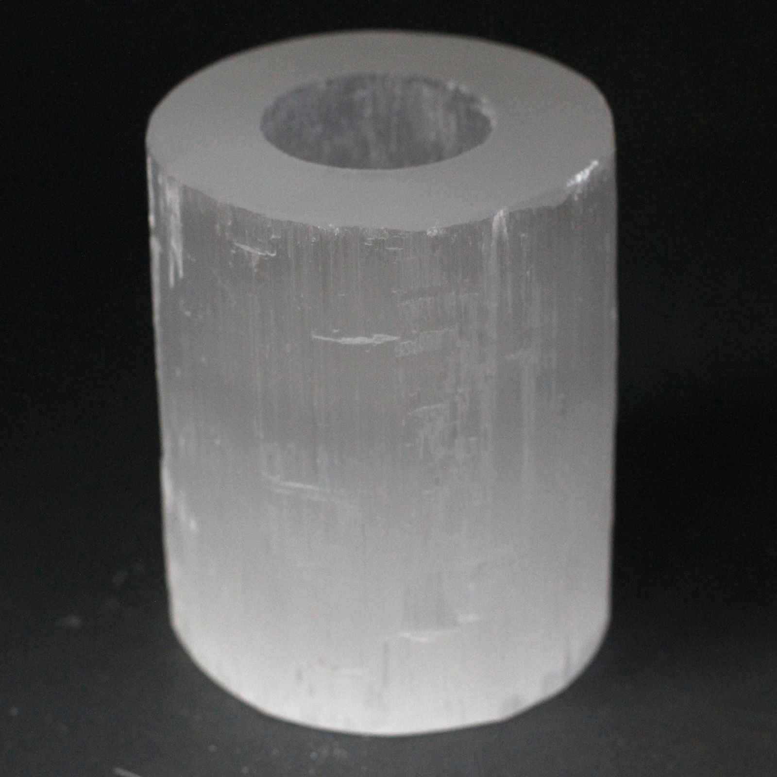 Selenite Candle Holders are shiny and sometimes with whiter areas. Top of each candle holder is polished and the underside is cut flat.