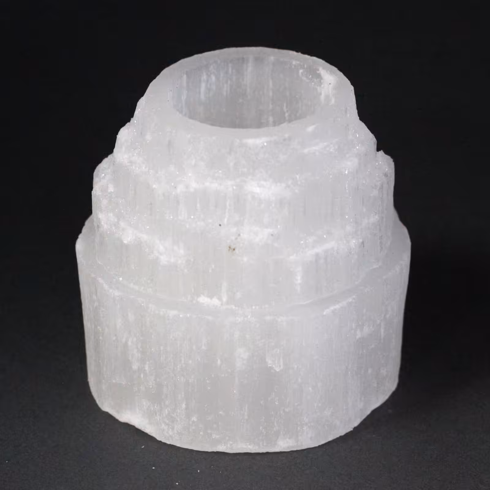Selenite Candle Holders are shiny and sometimes with whiter areas. Top of each candle holder is polished and the underside is cut flat.