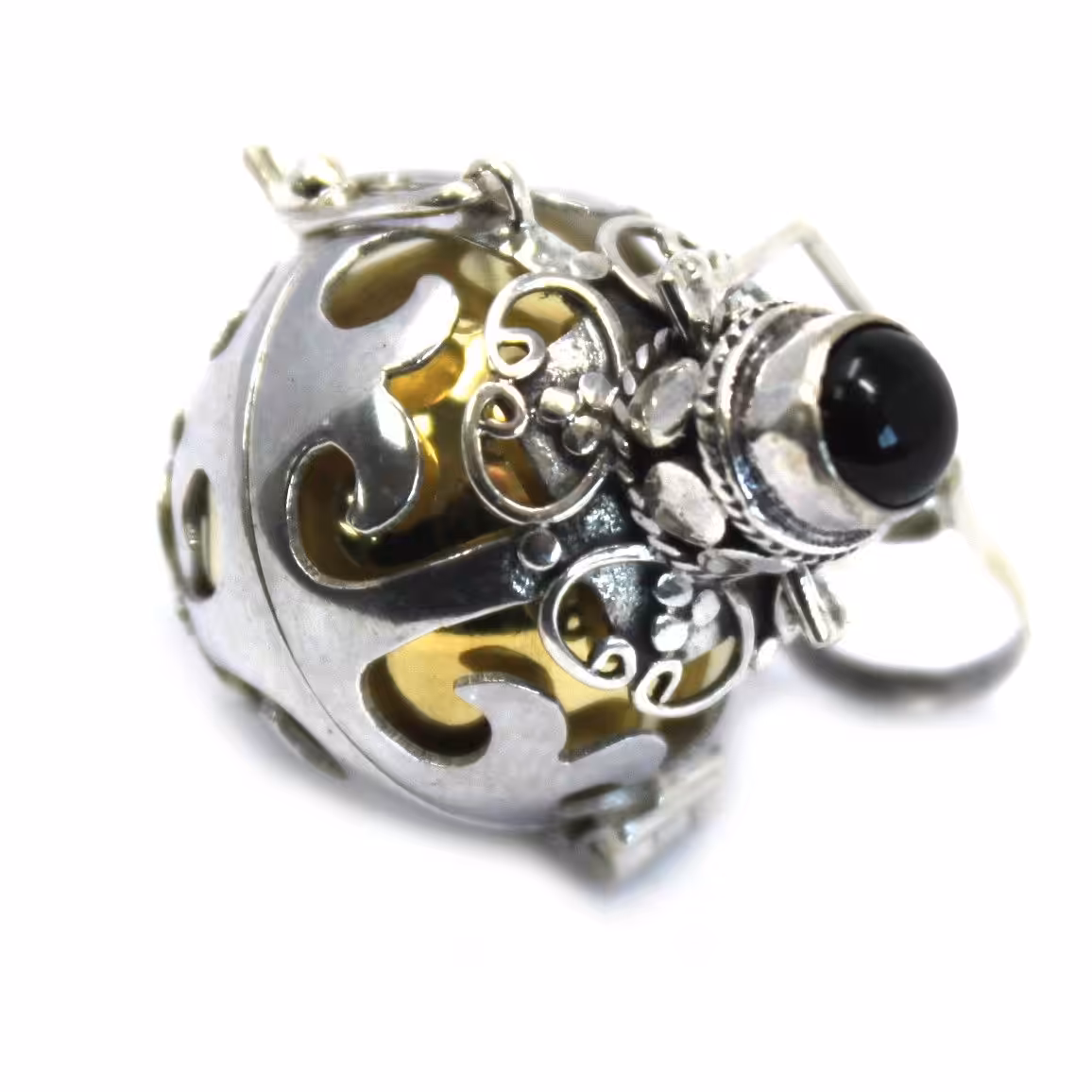 A gift of a silver angel bell, is truly a gift from the heart. Artisan made from Bali 92.5 silver. Neck cords also with silver detail and clasps. Bells are balanced brass or ceramic and resin