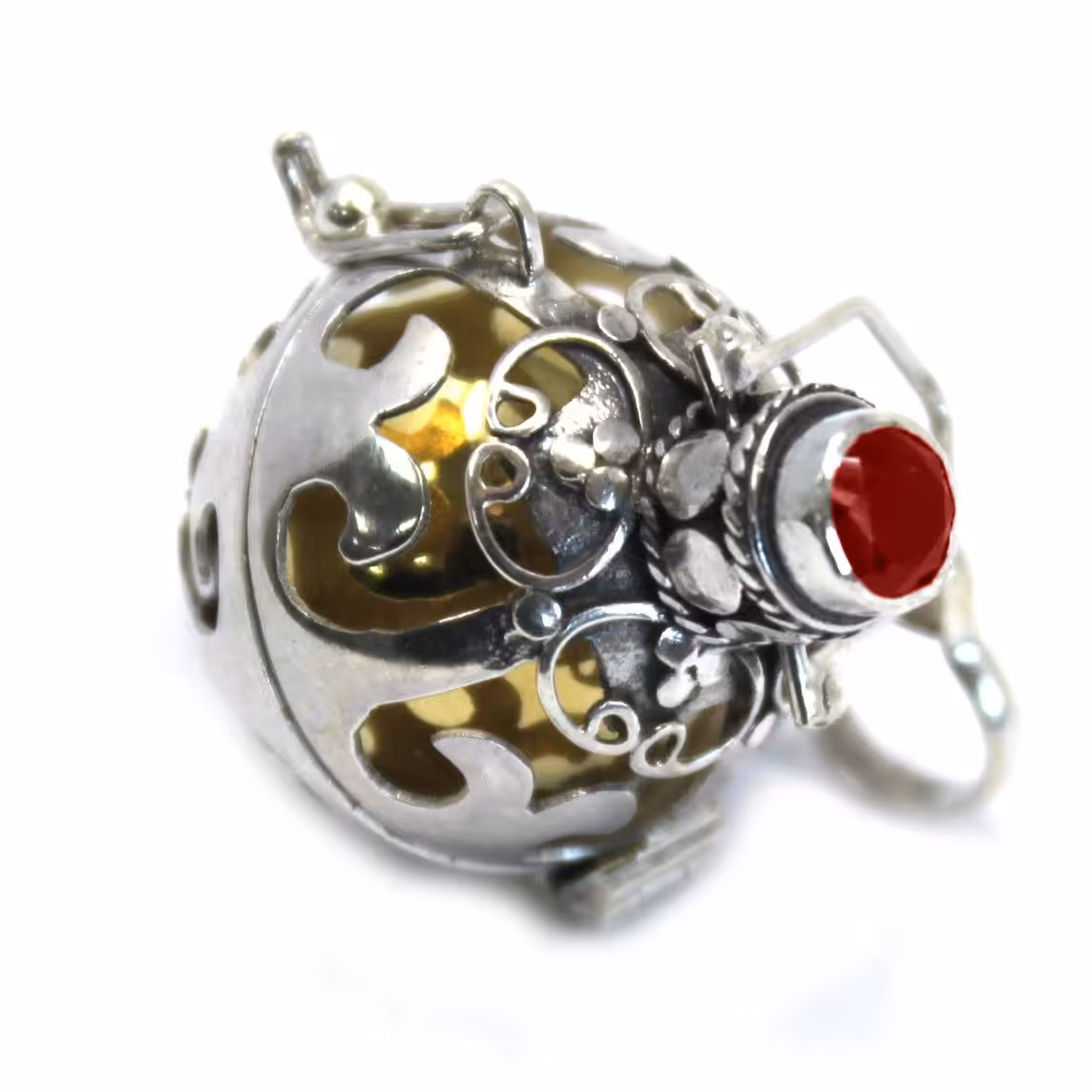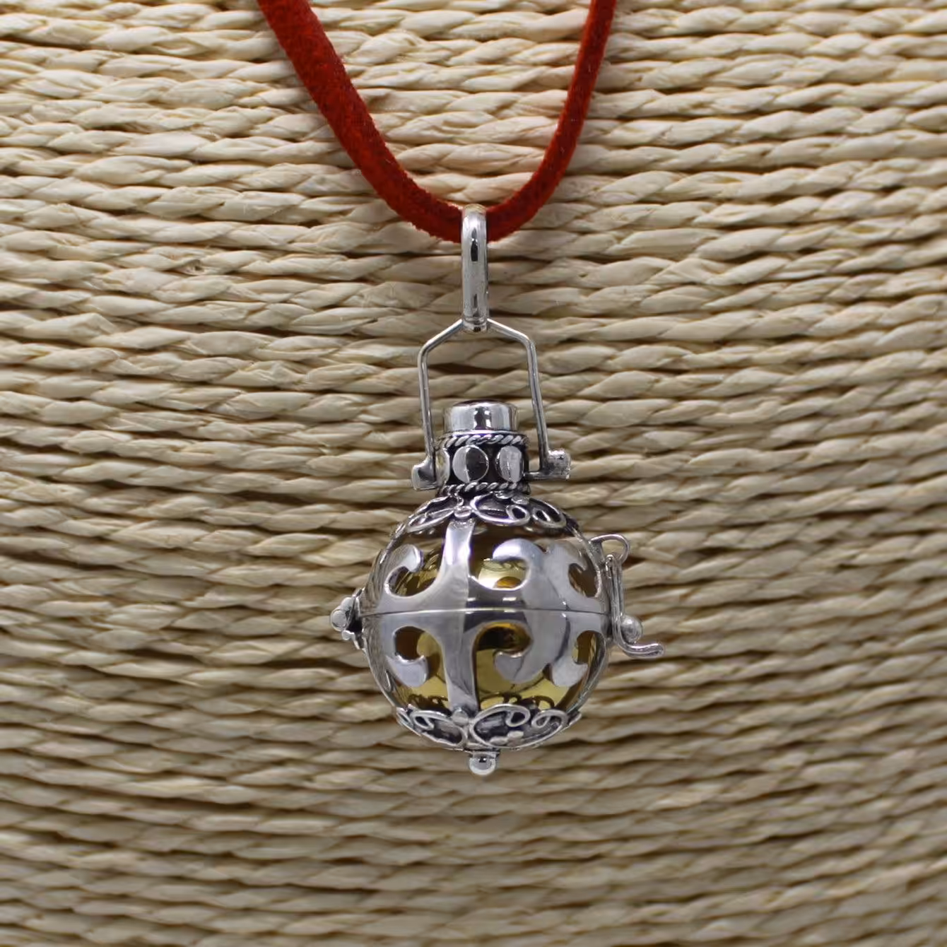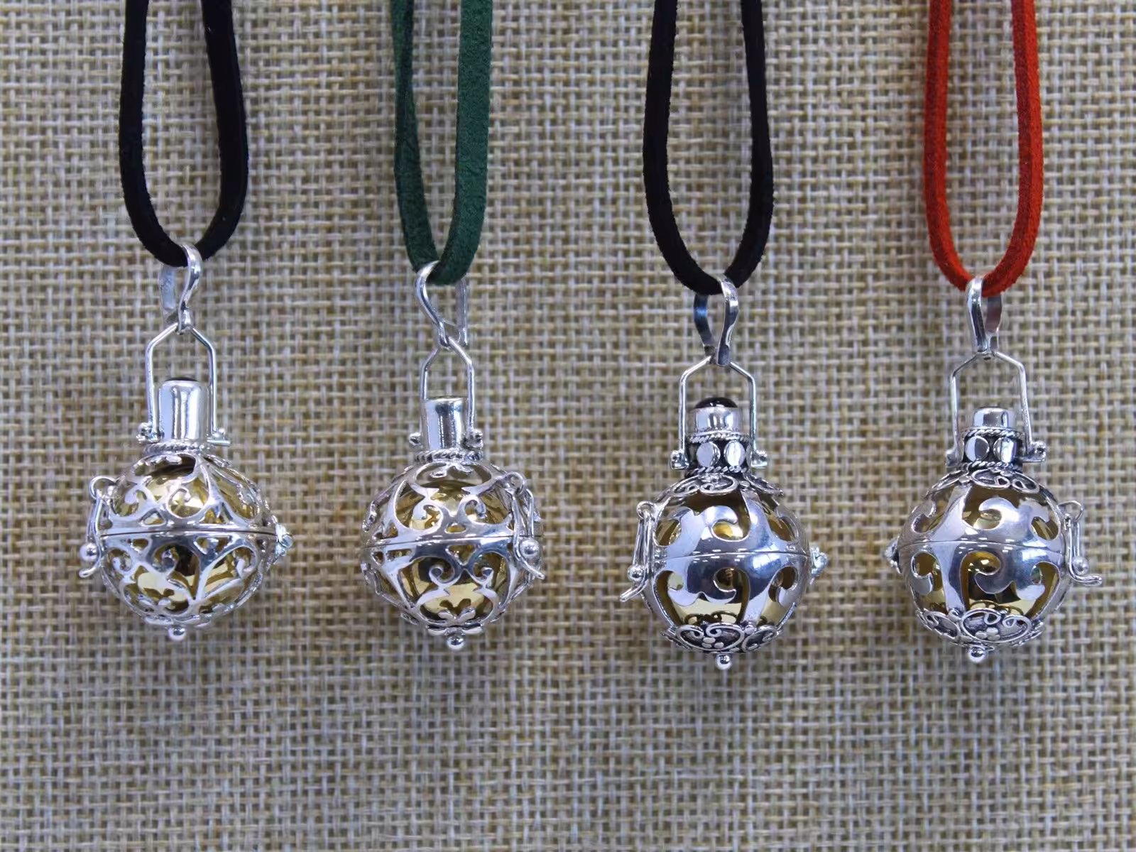 A gift of a silver angel bell, is truly a gift from the heart. Artisan made from Bali 92.5 silver. Neck cords also with silver detail and clasps. Bells are balanced brass or ceramic and resin