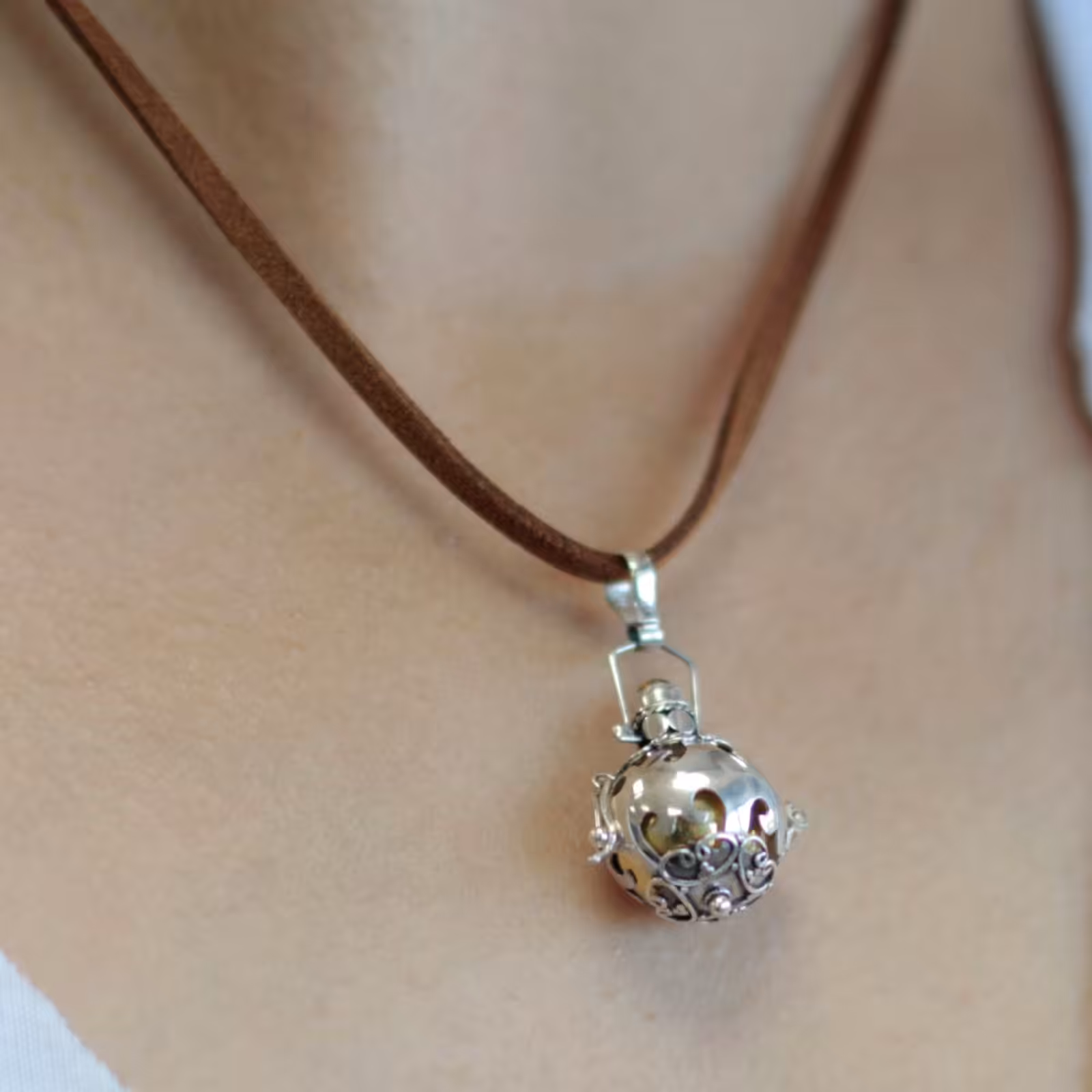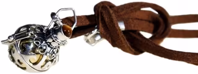 A gift of a silver angel bell, is truly a gift from the heart. Artisan made from Bali 92.5 silver. Neck cords also with silver detail and clasps. Bells are balanced brass or ceramic and resin