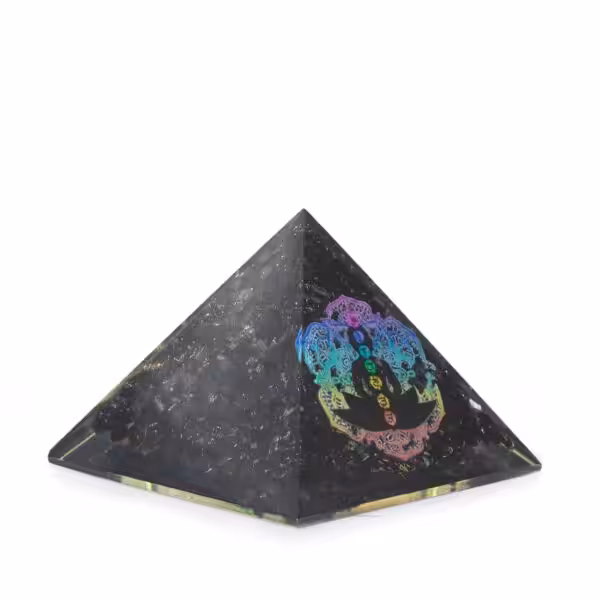 Compact yet powerful, this orgone pyramid combines black tourmaline chips with a striking rainbow Chakra Buddha motif. The design symbolises balance, groundingand spiritual protection, making it a thoughtful piece for meditation or energy work.