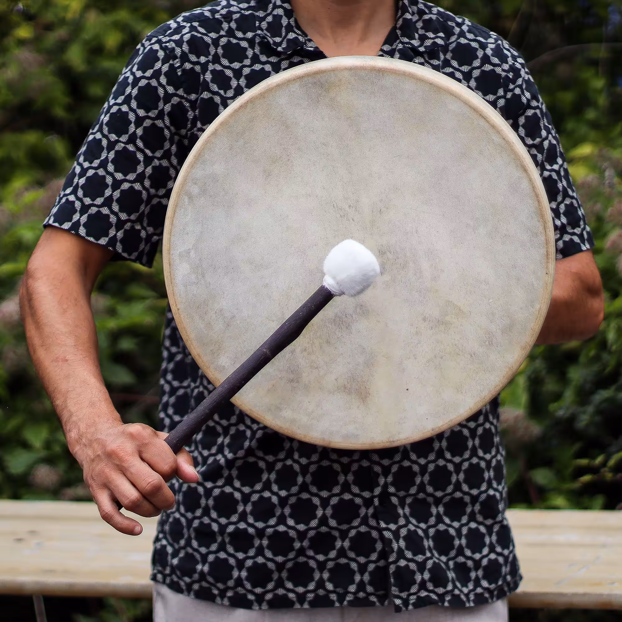 Hand-made in Indonesia from acacia wood and Goatskin, the Spirit of the Wolf Shaman Drum – 40cm combines authentic sound with striking design. The reverse features a hand-carved wolf head handle, a powerful symbol of intuition and guardianship that immediately sets this piece apart.