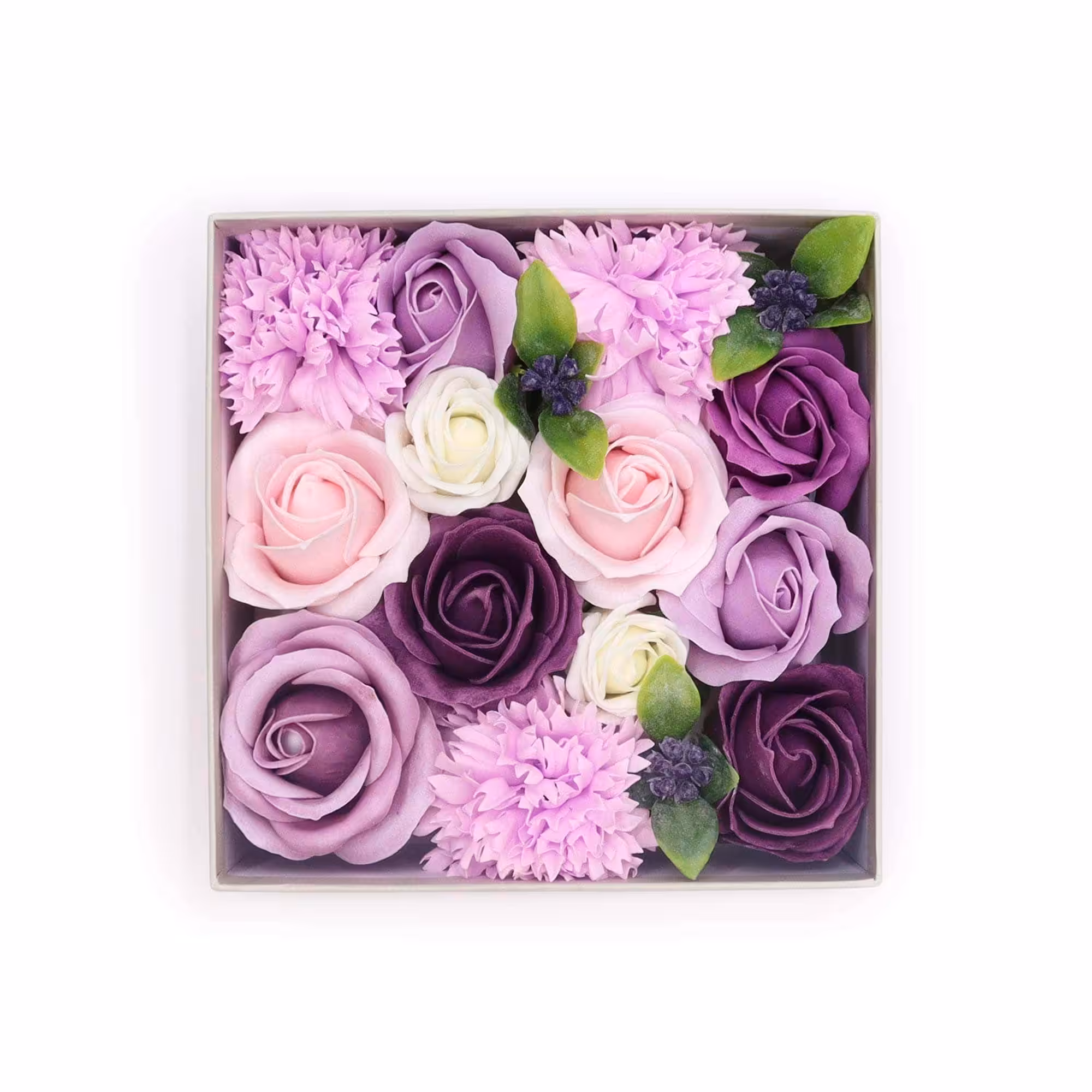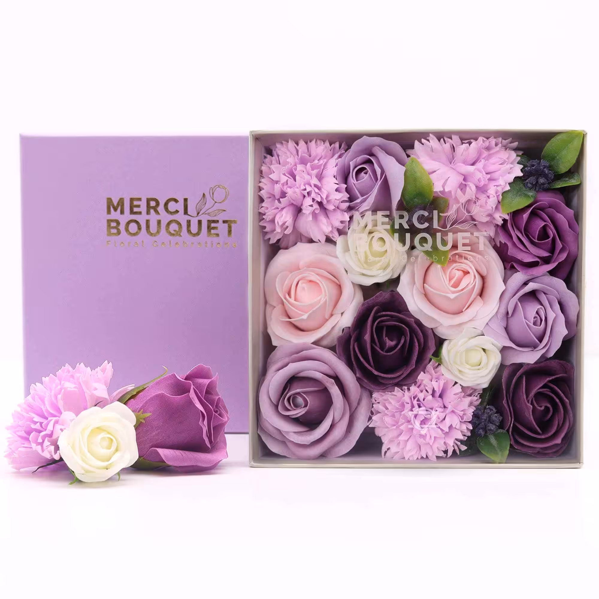 🌷 Royal Splendour: Inside the square box, you'll find a stunning ensemble of handcrafted soap flowers, showcasing purple roses and charming carnations.