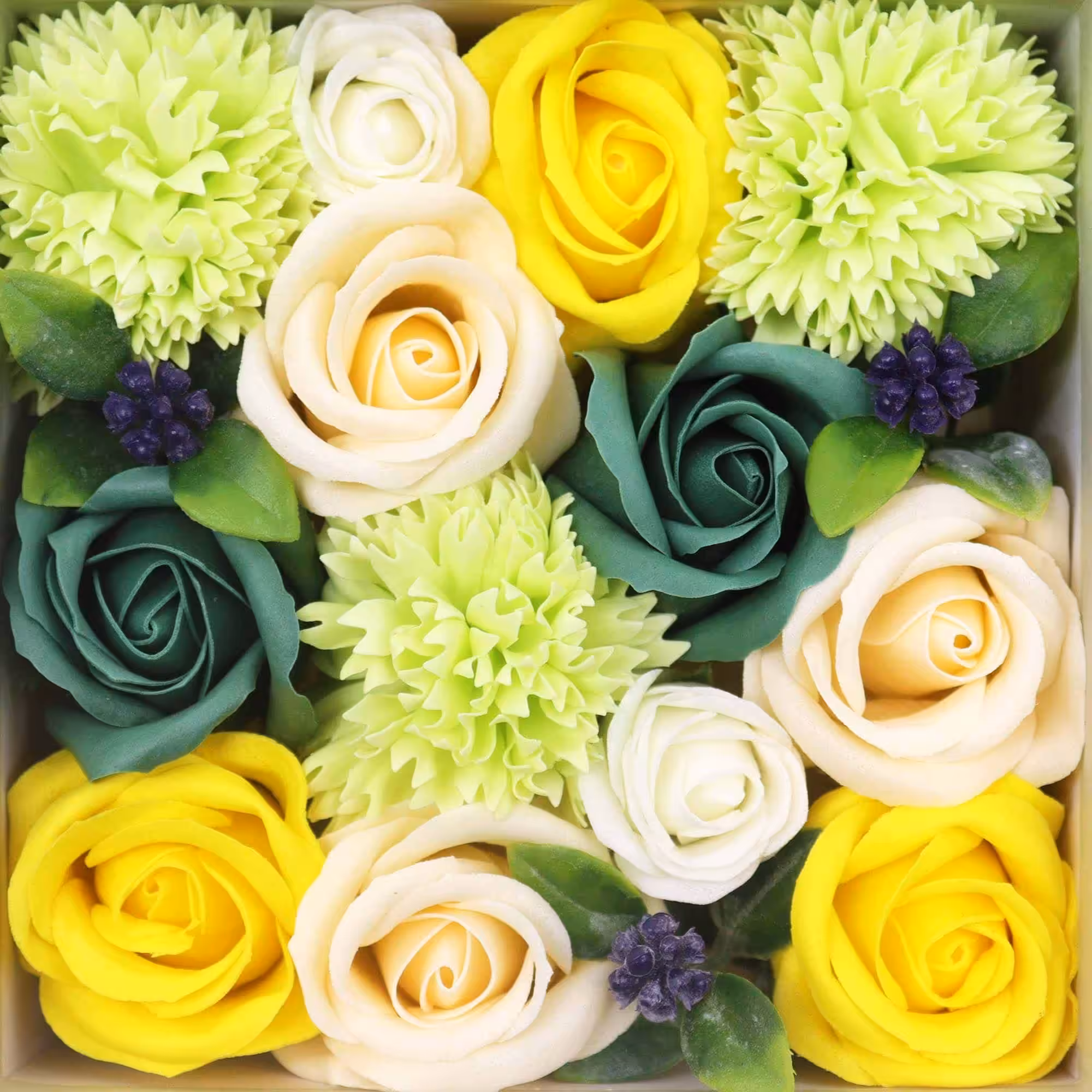 🌼 Blooming Beauty: Inside the square box, you'll discover a stunning array of handcrafted soap flowers in cheerful shades of yellow and lush greens, resembling a blossoming spring garden.