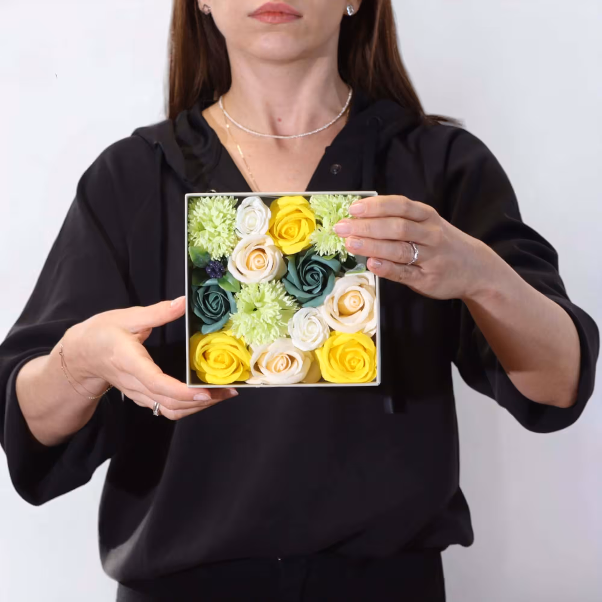 Soap Flower Gift Round Box – Square Box – Spring Celebrations – Yellow & Greens