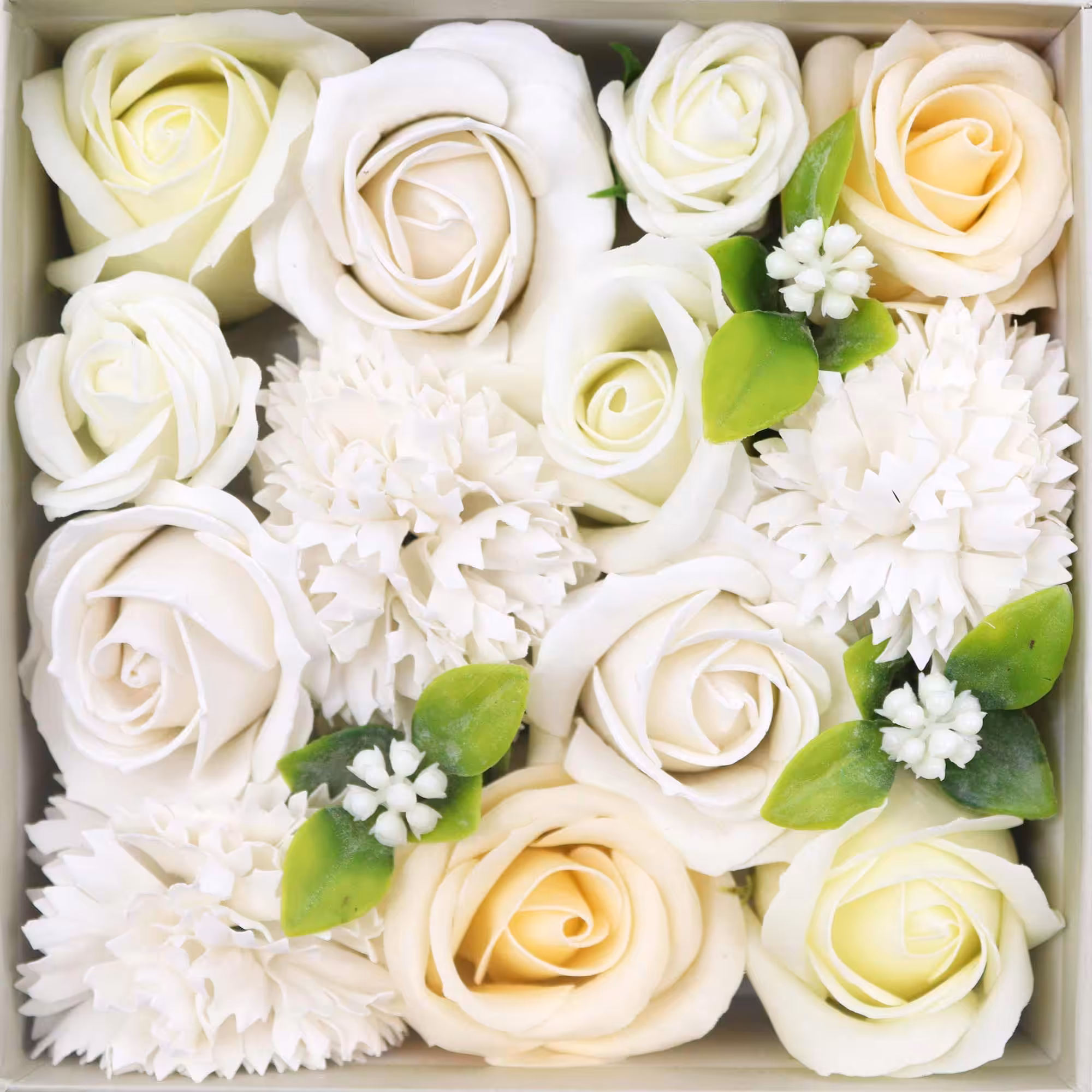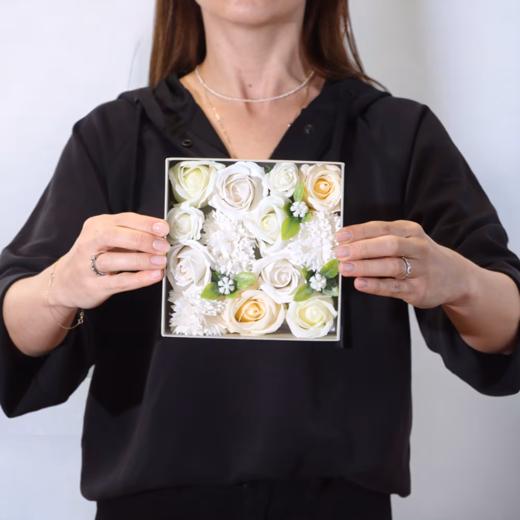 🌼 Floral Elegance: Inside the square box, you'll find meticulously handcrafted soap flowers, including delicate roses and other floral accents, adding a touch of sophistication to the gift.