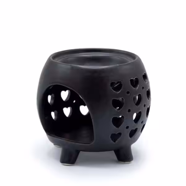The Squat Pot Oil Burner Multi Hearts in Matt Black is a stunning piece from our collection of various shaped ceramic oil burners. Designed to elevate your home ambiance, this burner not only serves a functional purpose but also acts as a chic decor item. Its unique heart-shaped cutouts allow the warm glow of candlelight to shine through, creating a cosy atmosphere perfect for relaxation or entertaining guests.