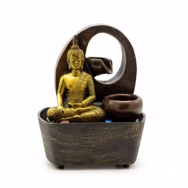 Featuring a golden Buddha statue seated peacefully in a bowl, water gently cascades over the rim and down into the pot, creating a relaxing flow.