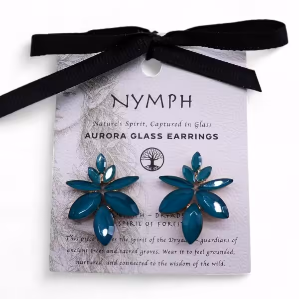 Inspired by Dryads – Spirits of the Forest, they represent nature’s quiet renewal and enduring grace. Alive with gentle energy, the Teal Green Flowers Earrings bloom like spring leaves after rain. Their glass petals catch the light softly, framed by polished stainless steel.