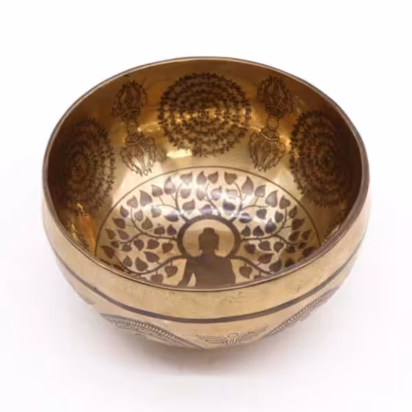 Crafted with care, this singing bowl is designed to produce rich, resonant tones that resonate deeply, helping to calm the mind and body. The engravings of the Bodhi Tree Buddha symbolise enlightenment and peace, making this bowl not just a musical instrument but also a meaningful artefact that can elevate your spiritual practices. Its size is ideal for both beginners and experienced practitioners, ensuring that you can enjoy the full benefits of sound healing.