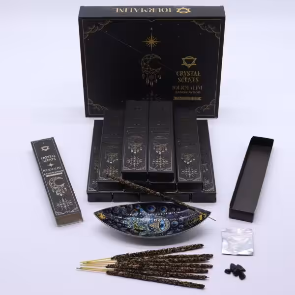 Crafted to promote relaxation and clarity, this incense not only enhances your meditation sessions but also helps to create a tranquil atmosphere in any room. The warm, woody fragrance of sandalwood is known for its ability to reduce stress and foster a sense of peace, while the tourmaline crystal is believed to provide protective energy and emotional balance. Together, they create a harmonious experience that encourages mindfulness and reflection.