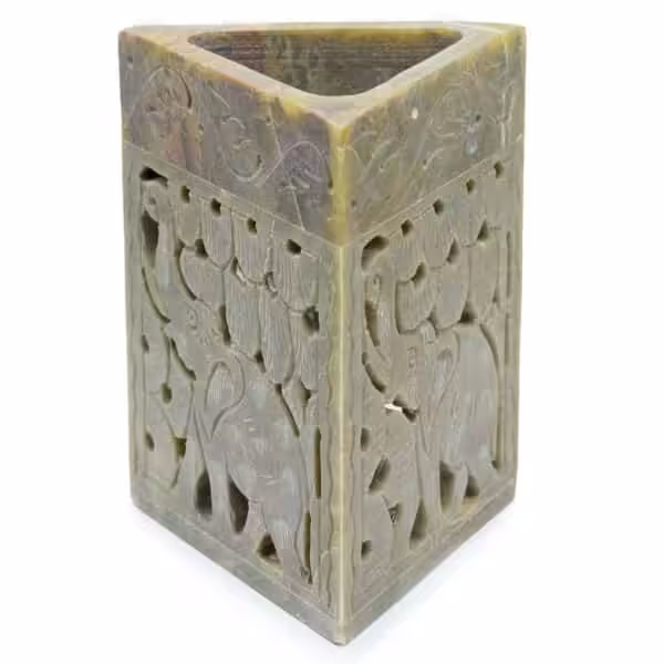 Add a unique flair to any space with this triangle-shaped soapstone oil burner, made in India. Featuring carvings of elephants, this oil burner embodies the beauty of traditional craftsmanship while delivering a functional piece for aromatherapy. Its triangular design offers a distinctive look and the natural earthy tones of soapstone make each piece unique. Perfect for warming essential oils or wax melts, this burner combines both aesthetic appeal and practicality, creating a calming ambiance in any room.