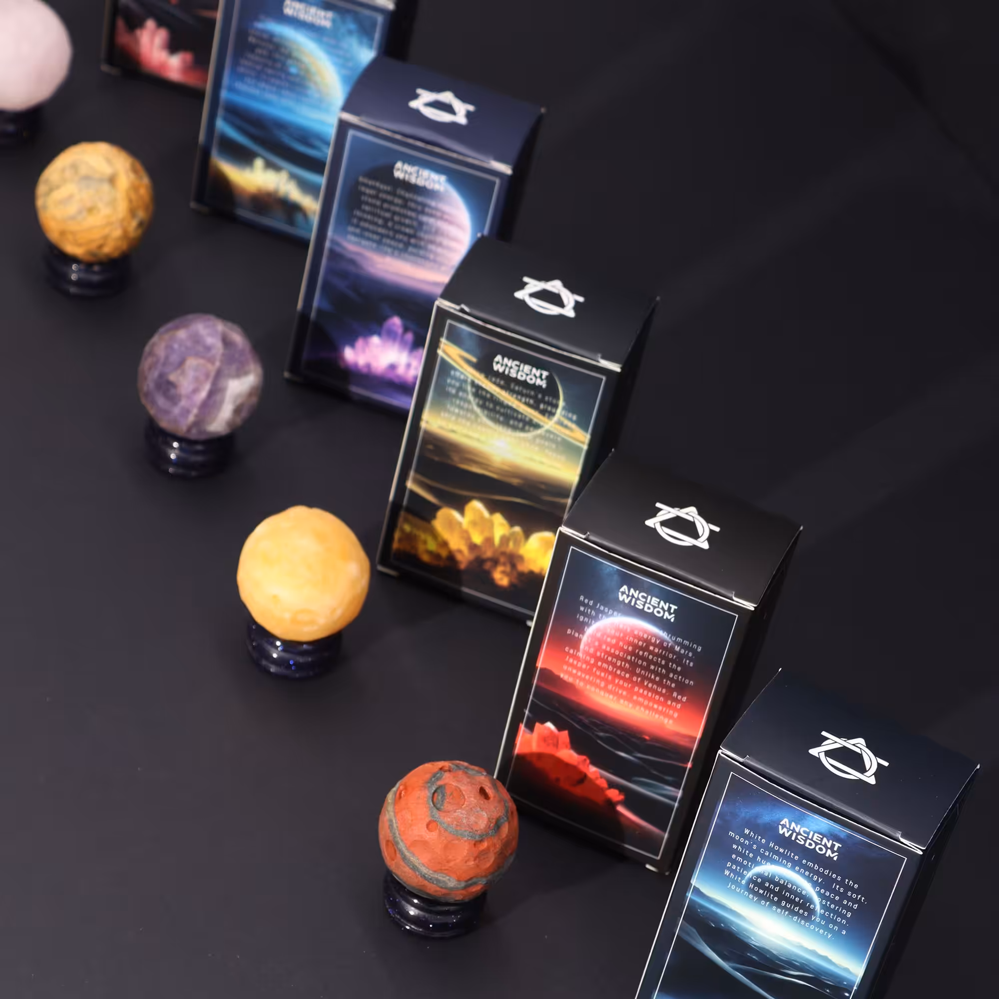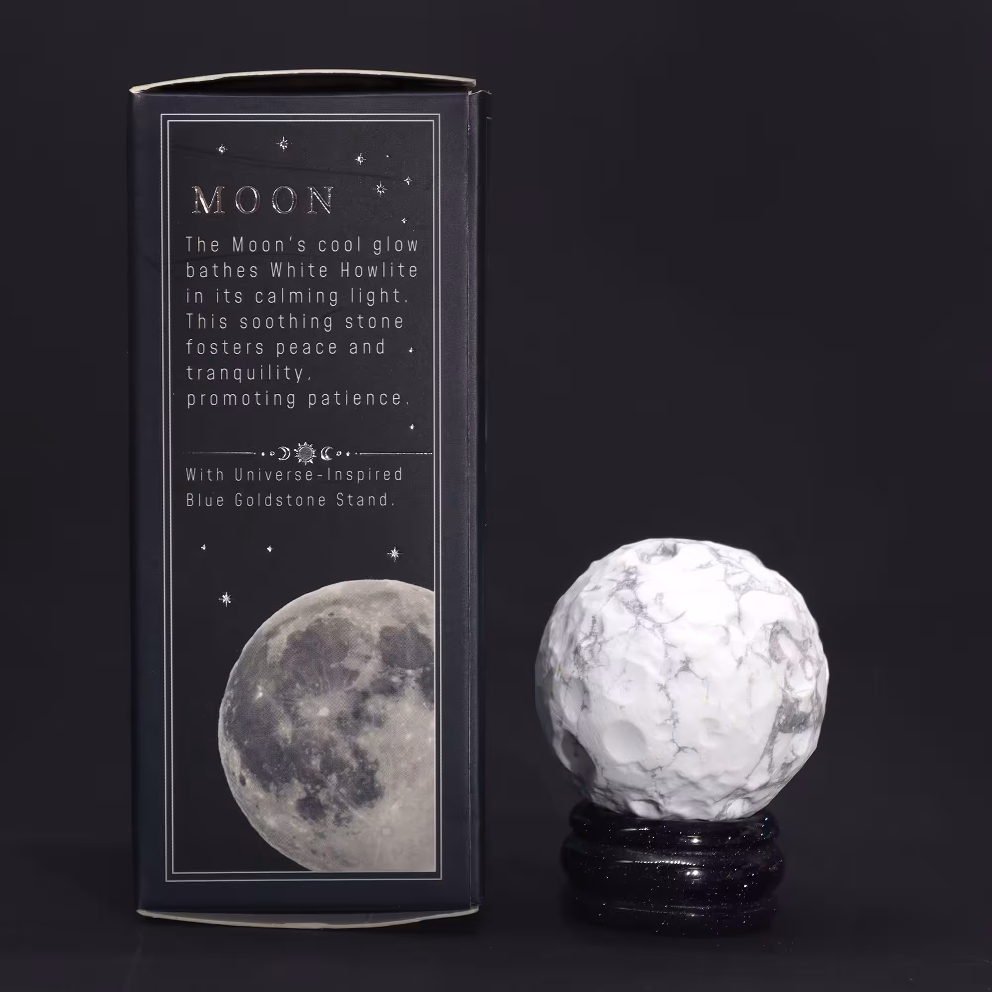 The Solar Goldstone Stand, inspired by the cosmic depths, provides a grounding base for the White Howlite sphere.