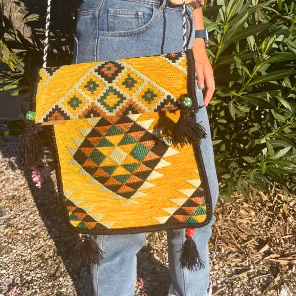 Yellow Kilim Summer Bag. This exquisite piece combines the rich and warm tones of with the vibrant energy of a festival. Crafted through the ancient art of Kilim weaving in Turkey, it showcases intricate patterns that capture attention and evoke a sense of cultural heritage.