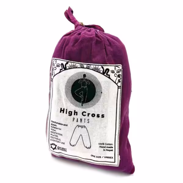 Embrace comfort and style with our Yoga and Festival Pants featuring a stunning High Cross Himalayan Print on Purple, perfect for yoga sessions and festivals alike.