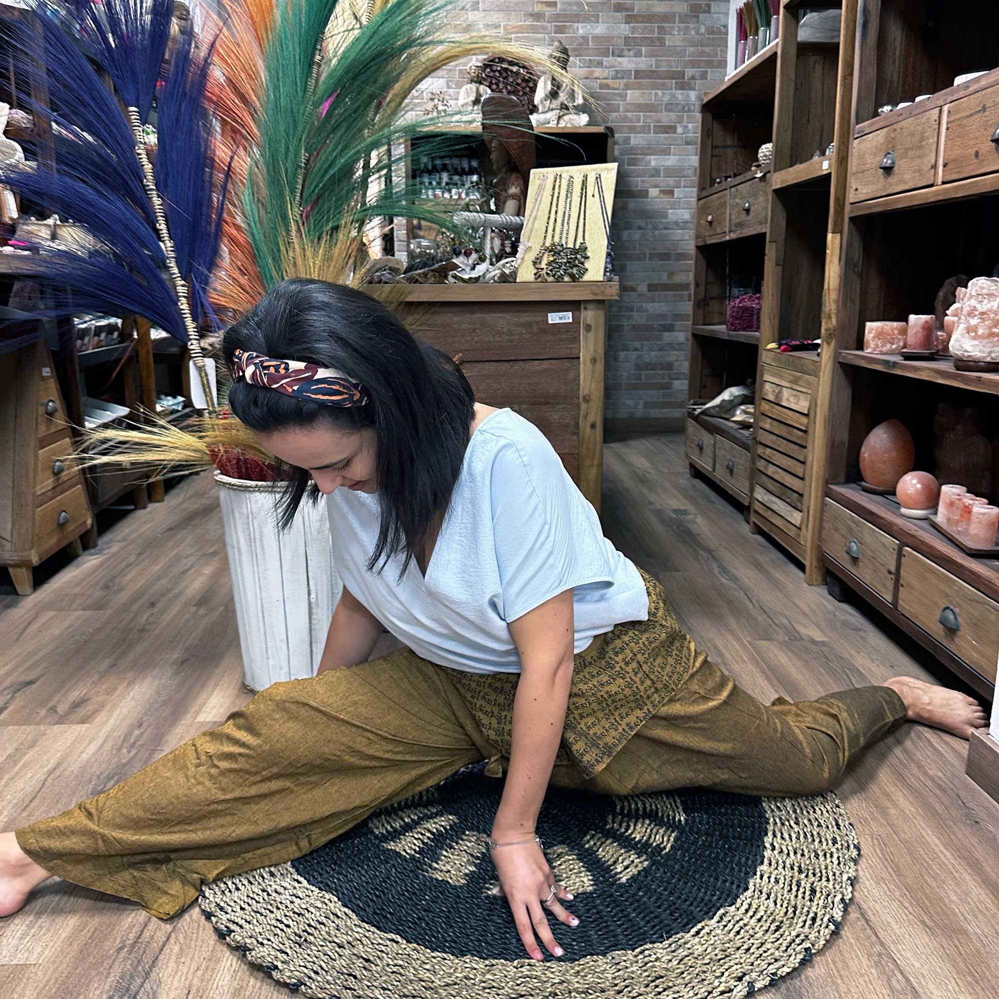 These pants are known for their spacious and comfortable design, making them a great option for yoga, various physical activities and everyday casual wear.  Made from 100% cotton in Nepal  Unisex and one sizeThe pants come in a compact cotton pouch.