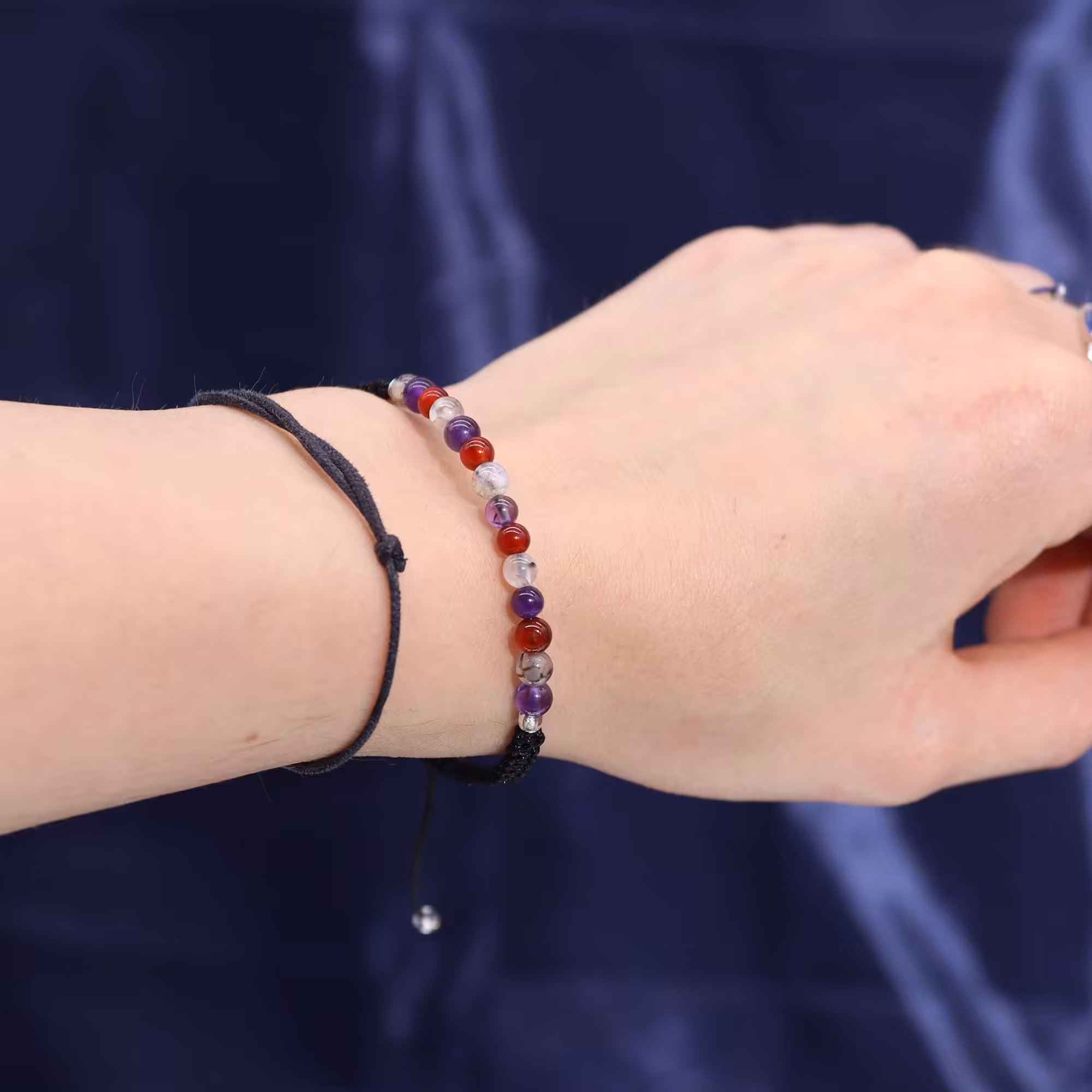 The set includes a gemstone bracelet made with amethyst, carnelian and moss agate, selected to resonate with Virgo’s nurturing and analytical qualities: